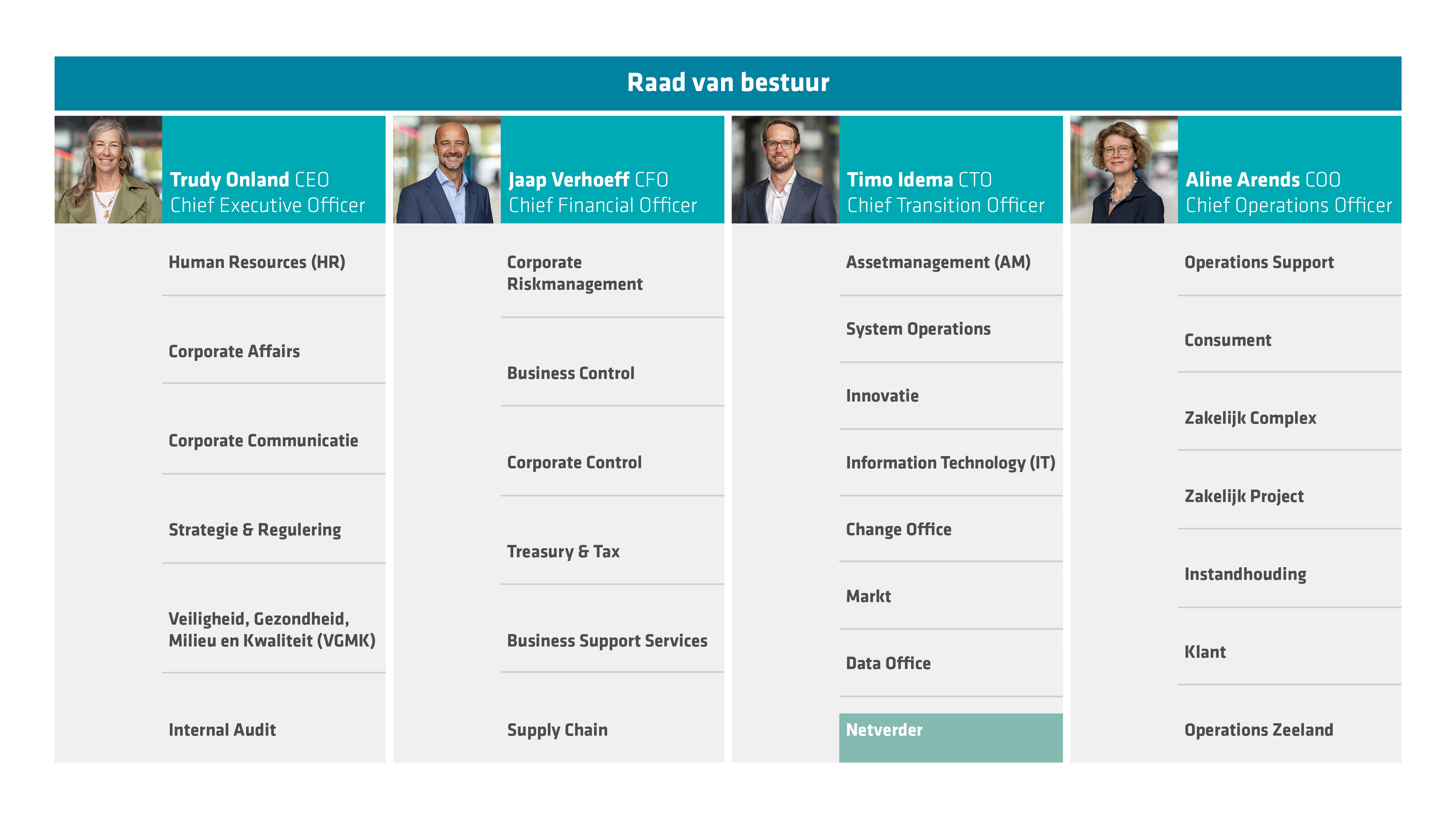 De RvB wordt benoemd door de raad van commissarissen (RvC) en legt verantwoording af aan de RvC en de Algemene Vergadering van Aandeelhouders (AvA). De RvB van Stedin Groep bestaat uit Trudy Onland, Aline Arends, Timo Idema en Jaap Verhoeff.