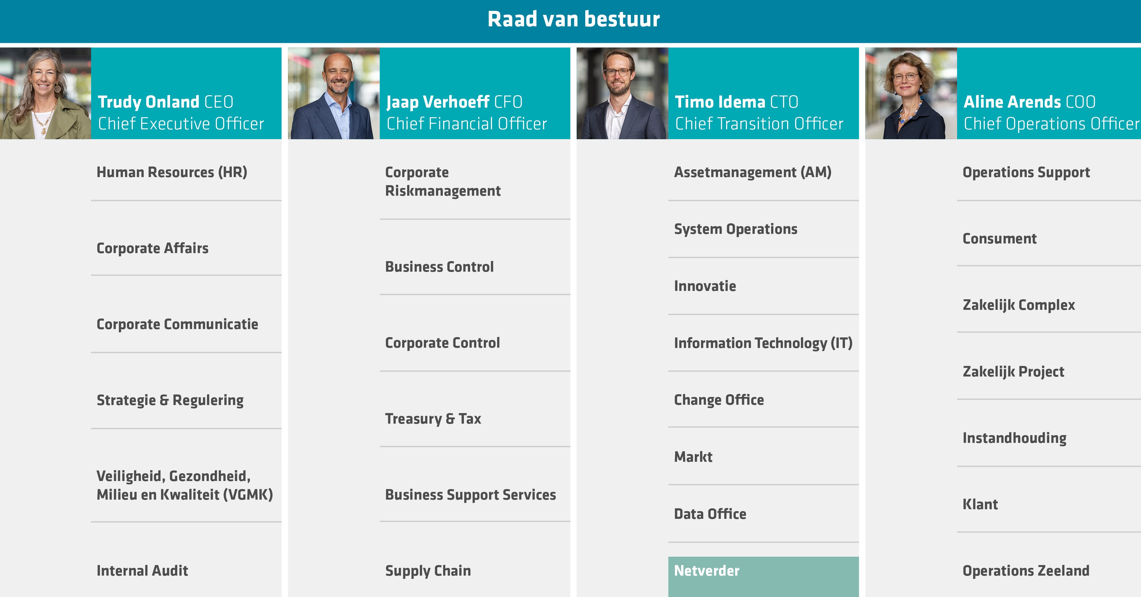 The Executive Board members are appointed by the Supervisory Board and are accountable to the Supervisory Board and the General Meeting of Shareholders (AGM). The Executive Board of Stedin Group consists of the members: Trudy Onland, Aline Arends, Timo Idema and Jaap Verhoeff.